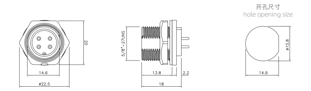 | E10 Male Back Mount PCB Receptacle(Threaded) | 300V | 10A | E10T-P4B-PPF | 4B | ||