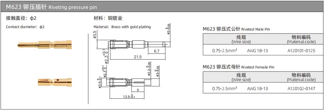 | M623 Riveted Male Pin 2mm | A120101-0125 | 0.75-2.5mm² AWG: 18-13 | ||