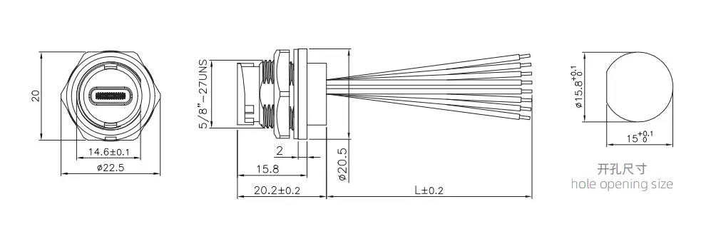 TYPE-C Female Back Mount Receptacle with wire(Threaded)