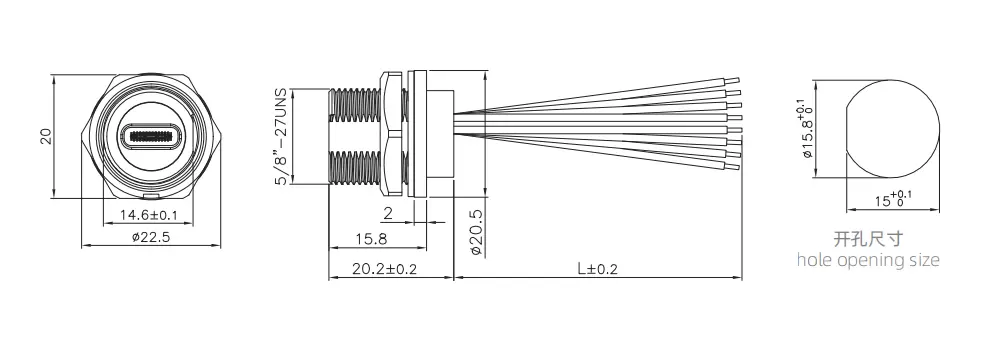 | TYPE-C Female Back Mount Receptacle with wire(Threaded) | TYPE-C 3.0 | E10T-FT3-PWF-0.2PV |