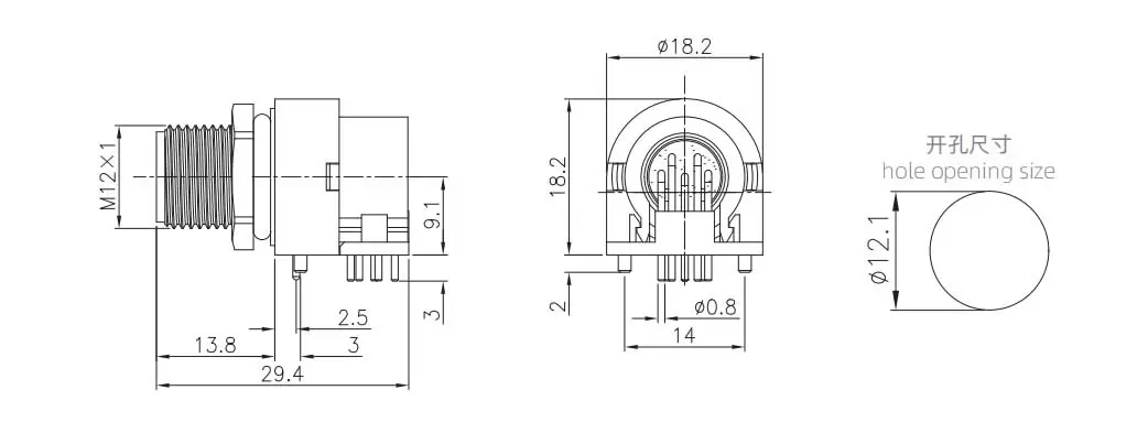 | M12 Curved Needle Socket (PCB, Screw M12*1, Big volume) | M12-P3A-GPL M12-BS | 3A | ||