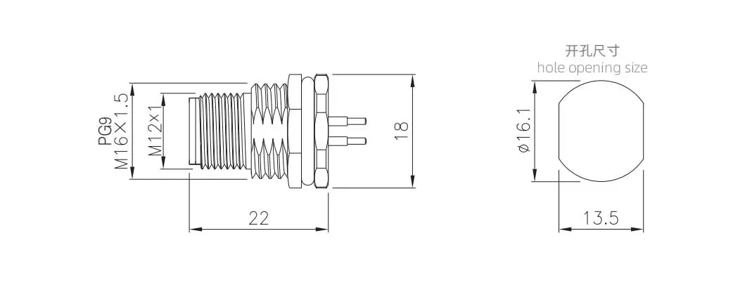 | M12 Male Back Mount Socket (PCB) | M12-P3C-GPFM16 | M12-P3C-GPFP9 | 3C | ||
