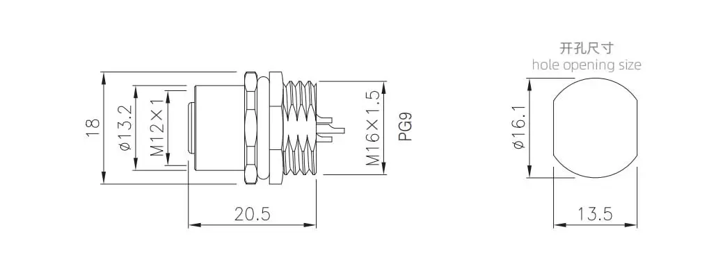 | M12 Female Front Mount Socket (Solder) | M12-S4C-GWBM16 | M12-S4C-GWBP9 | 4C | ||