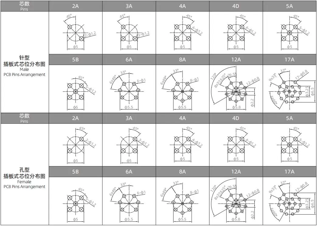 Contacts number:2, 3, 4, 5, 6, 8, 12, 17pins
