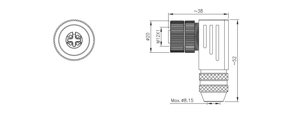 | M12 Angled Female metal assembled plug | M12-S8A-GLDP7-N-TT | M12-S8A-GLDP9-N-TT | 8A |