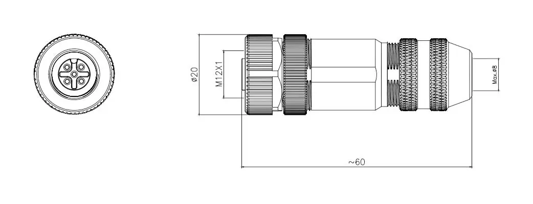 | M12 Straight Female Metal Assembled Plug (Screw) | M12-S8A-GLAP7 | M12-S8A-GLAP9 | 8A |