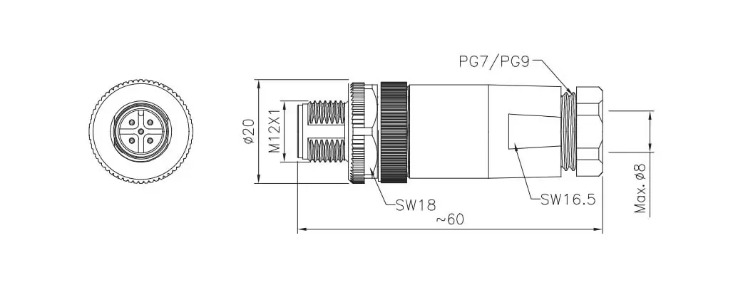 | Straight Male Plastic Assembled Plug | M12-P8A-PLAP7 | M12-P8A-PLAP9 | 8A |