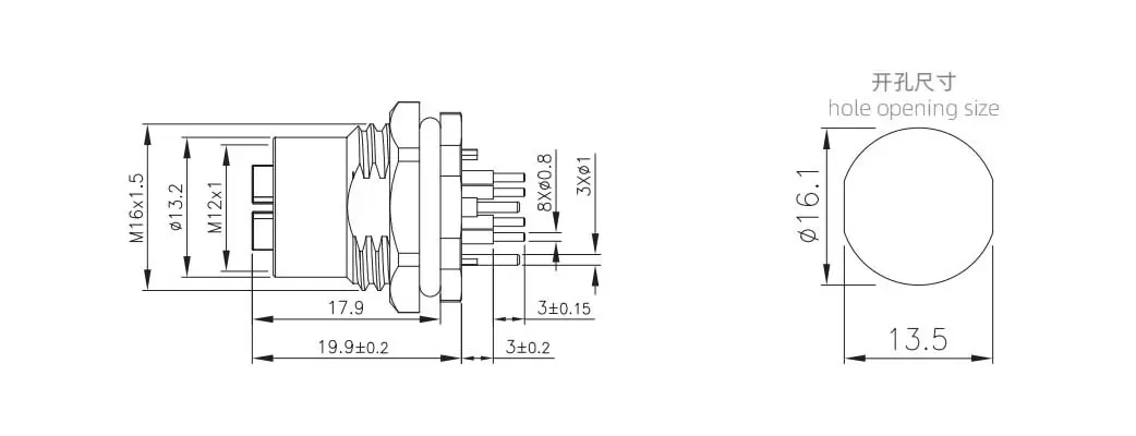 | M12 Female Back Mount Socket (Data type, PCB, Screw M16*1.5) | M12-S8X-GPFM16 | 8X | ||