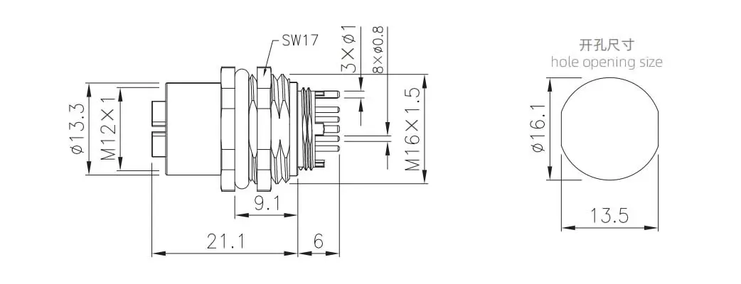 | M12 Female Front Mount Socket (Data type, PCB, Screw M16*1.5) | M12-S8X-GPBM16 | 8X | ||