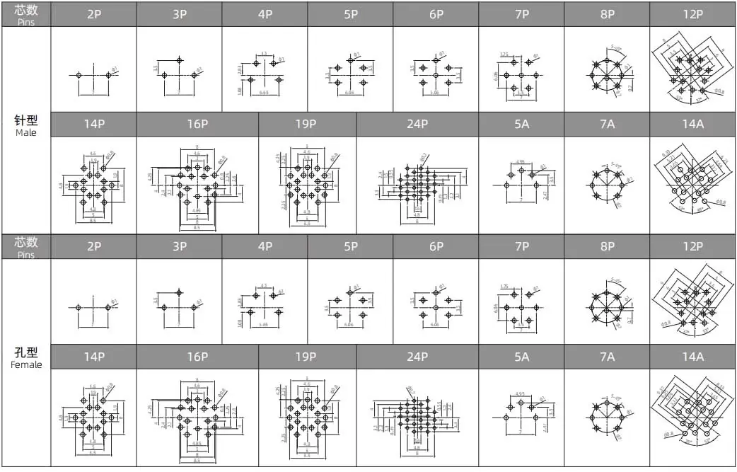 | M16 Female Front Mount Socket(PCB) | M16-S14-GPBM18 | 14 Pin | ||