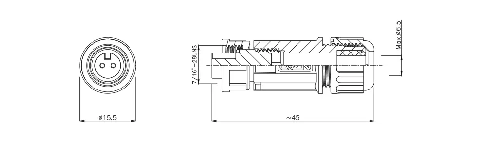 | E7 Straight Female Field Installable Plug (Threaded) | 60V | 2A | E7T-S6-PWA06 | 6 |