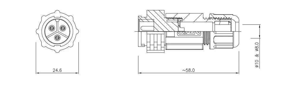 | E13 Straight Male Assembly Plug(Bayonet) | 125+30V | 15+2A | E13B-P8C-PWK08 | 8C |