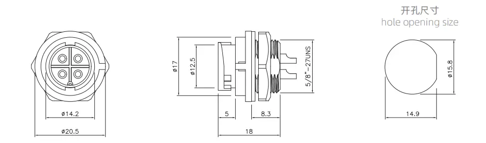 | E10 Male Front Mount Solder Receptacle(Bayonet) | 60V | 5A | E10B-P5-PWB | 5 | ||