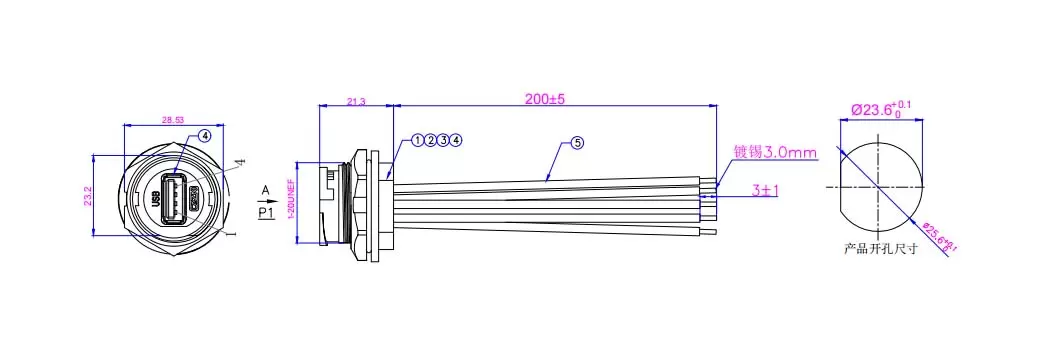| E16 USB Female Back Mount Receptacle with wire(Bayonet) | USB 3.0 | E16B-FU3-PWF-0.2PV |